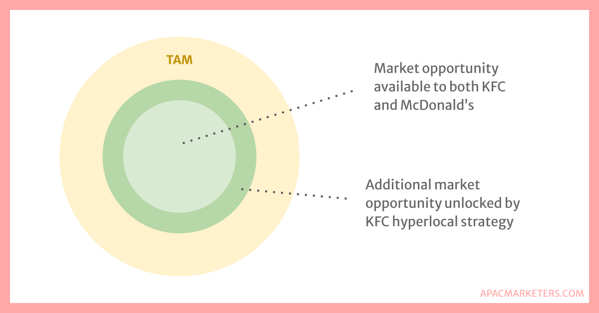 When they were plotting their entry, McDonald's and KFC likely arrived at similar TAM estimates. But it was KFC's hyperlocal strategy that gave them the ability to actually realize that TAM: