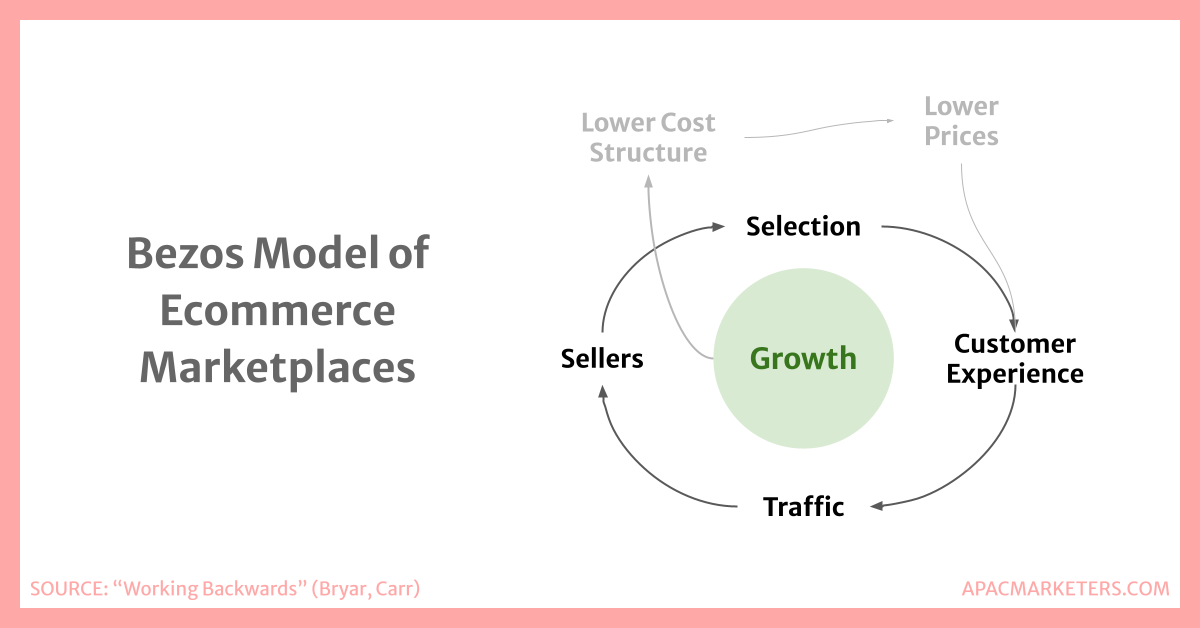 This is the drawing that Jeff Bezos used to guide the Amazon ecommerce business for decades. I'm not sure what's more impressive: that he drew this on a napkin over coffee, or that this model is relevant whether it's being used in America or Southeast Asia.